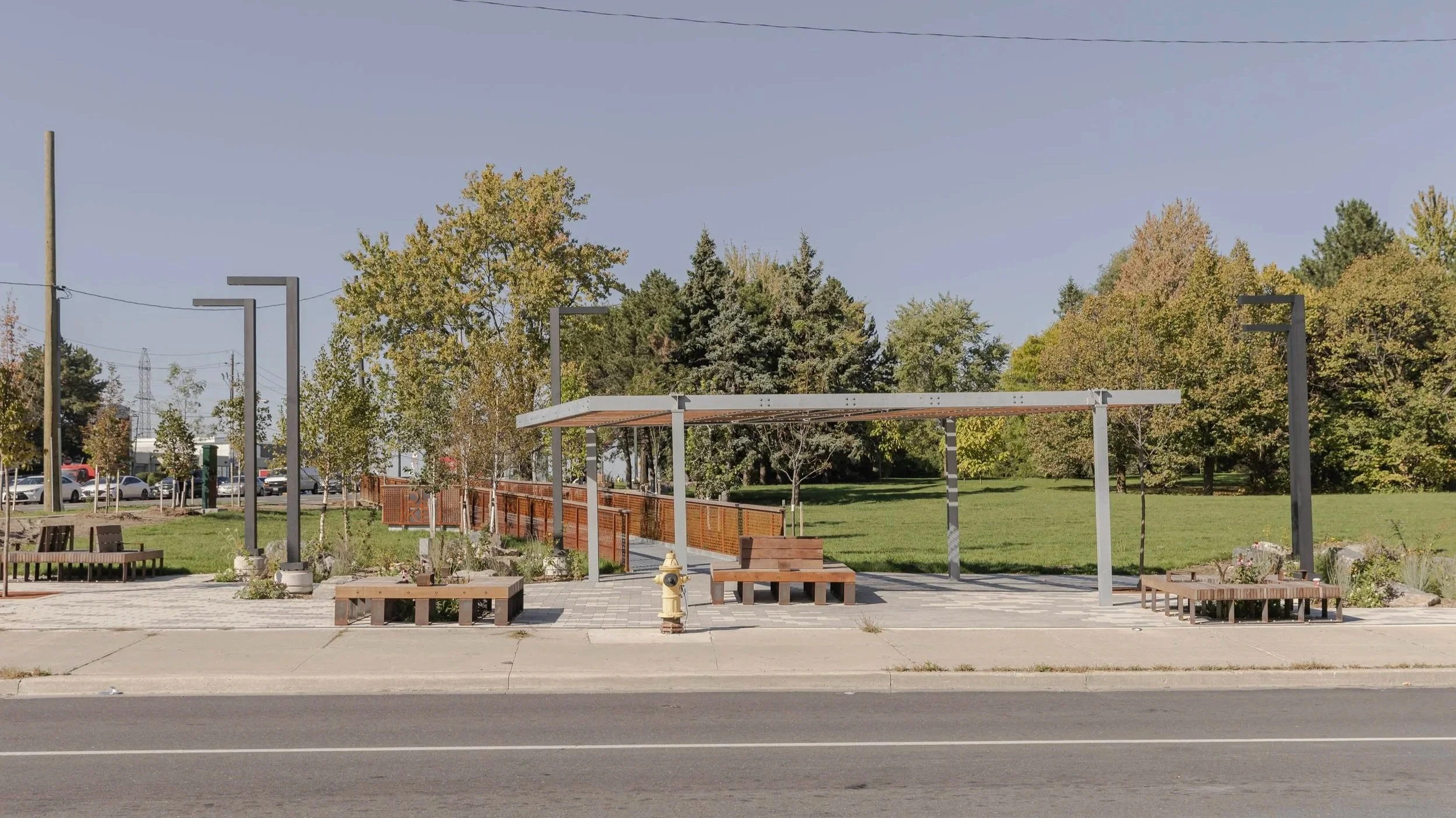 The park replaces a defunct TTC bus loop and acts as a functional circulation route between existing TTC bus transfer stops and the western gateway to the DUKE Heights BIA corridor along Finch Avenue West. The project features two plaza spaces, each serving a busy TTC bus stop with ample square Ipe wood benches, planting beds with raised pedestrian walkways, decorative boulders and canopy trees. The south most plaza on Finch Ave. West features a custom galvanized steel pergola has a custom designed weathering steel panel with laser cut DUKE logo pattern which will reveal itself in on the pavement when sun shines. The custom DUKE logo weathering steel panel ties into the railings of the pedestrian walkway that traverses the edge of the G. Ross Lord Park to take TTC users to their connecting bus on Dufferin Street. This project formalizes a desire line that pedestrians have used for years on the former defunct TTC bus turnaround route, and enhaces the experience with native perennial and canopy tree plantings along the route.
